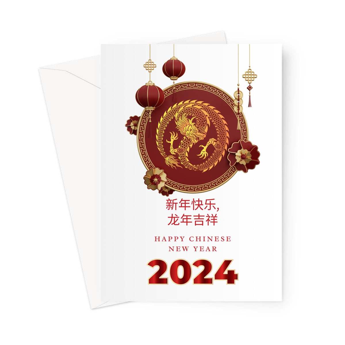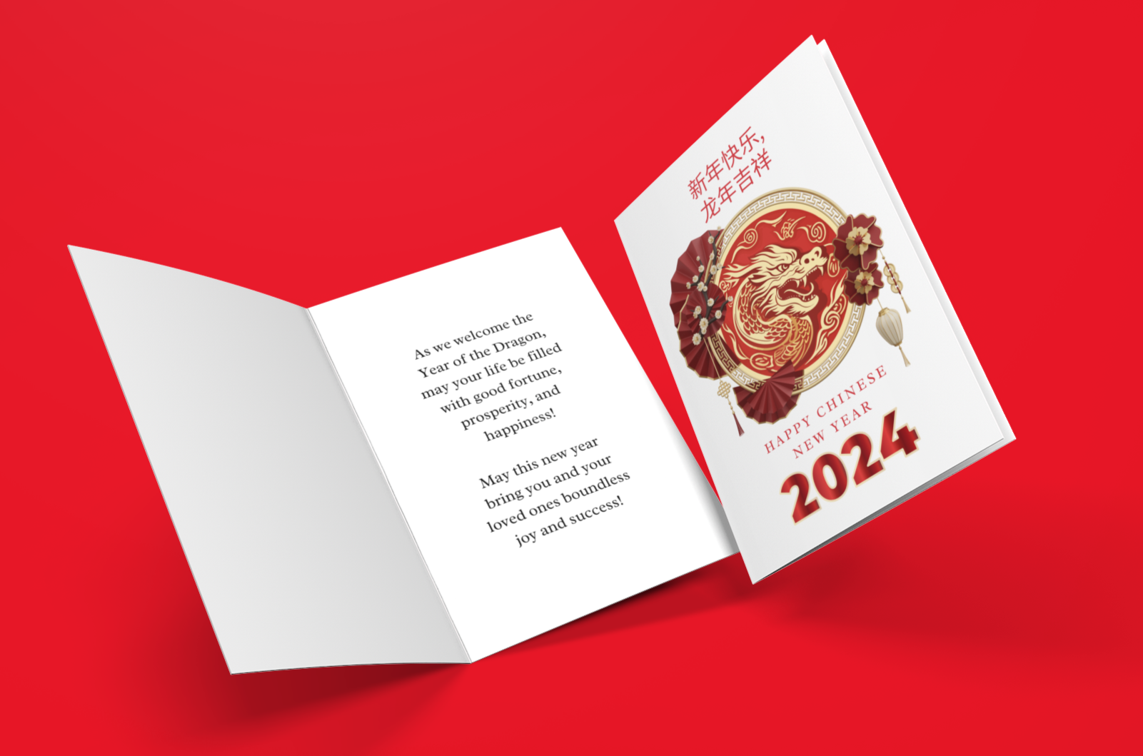 Lunar New Year greetings card, Dragon-themed greeting card, Chinese zodiac wishes card, Festive Spring Festival card, Year of the Dragon celebration, Lunar New Year blessings, Chinese cultural greeting card