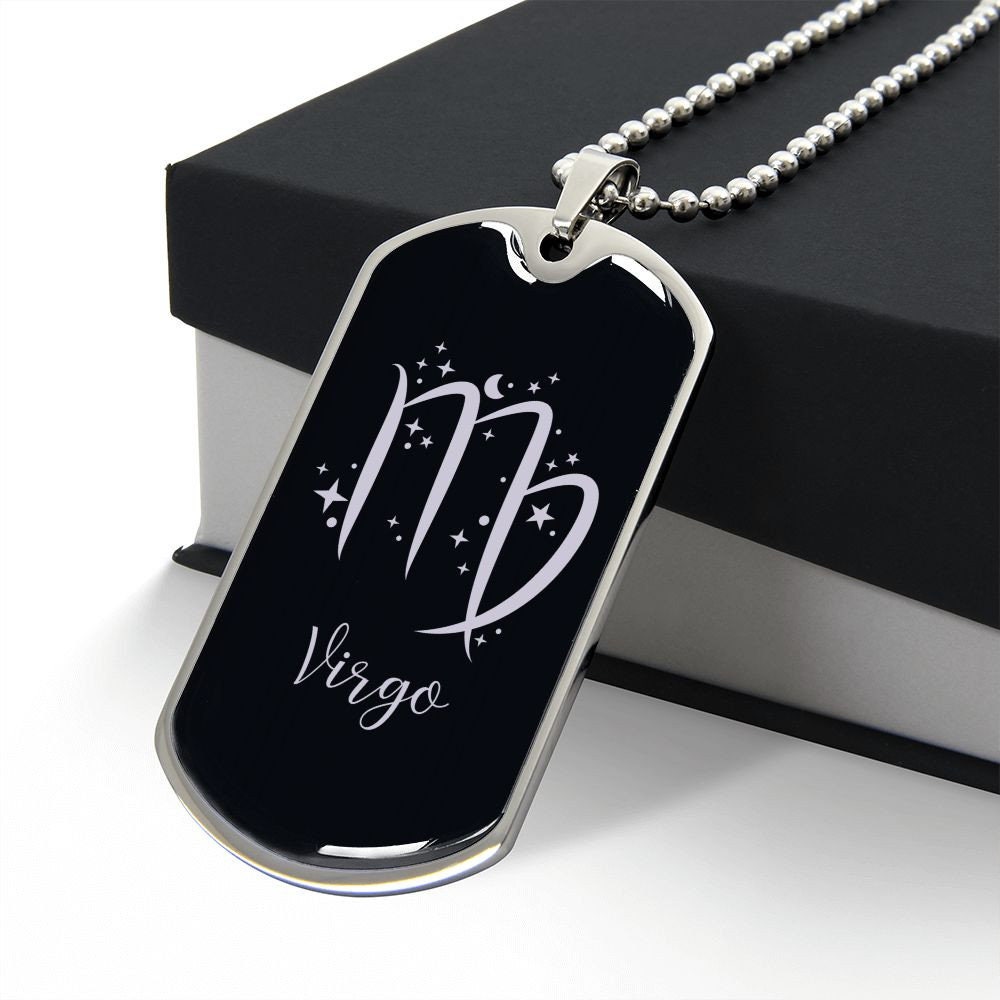 Shipped with love from Florida to USA and from Amsterdam to UK and EU. This Virgo Zodiac Necklace Gift is the perfect accessory for any stylish and thoughtful man. Born between August 23rd-September 22nd, the men born under this sign of the Zodiac are known for their hardworking approach to life combined with great attention to detail. Whether it be as a birthday gift or simply a reminder of how much you care, our Dog Tag Necklace is sure to show your recipient how special they are.Our Dog Tag Necklace is an ideal gift to show someone special just how much you care! Made from high-quality stainless steel with a shatterproof liquid glass coating, this patent-pending jewelry has been crafted for durability and style. Our necklace boasts a 24" (61cm) chain with an upgraded clasp and the dog tag measures 28.5mm x 51mm, making it the perfect size for layering. To further personalize this one-of-a-kind necklace, take advantage of our custom engraving option to engrave onto the back of the pendant your loved one's name, a special date, or anything else you want. This personalized piece will make an instant classic in any wardrobe and is sure to bring your loved one joy! This Jewelry Item Is the Perfect Keepsake! Whether for Yourself or a Loved One.